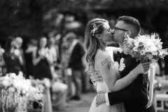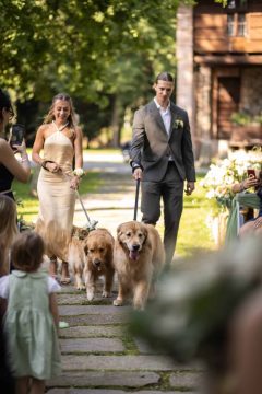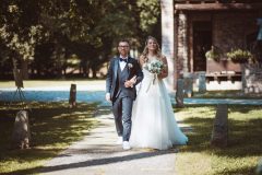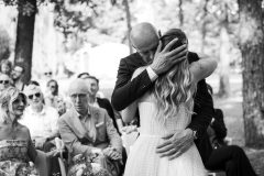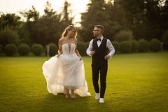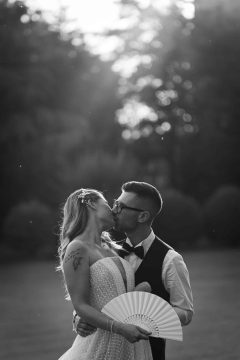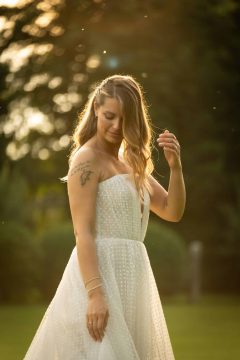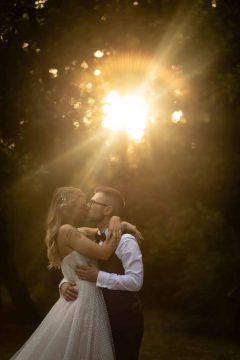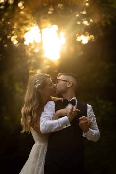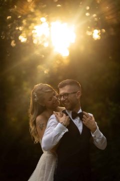 Quando la luce cala e diventa dorata è il mio momento preferito per ritagliarmi alcuni minuti di foto di coppia con gli sposi. Prima di chiamarli con me mi addentro in un boschetto (dove sono sicura che nessun fotografo aveva mai portato due sposi) e noto un posticino tra le fronde dove il sole esplode letteralmente tra gli alberi creando una luce unica. Chiamo subito gli sposi "Fidatevi di me! Venite!"… il risultato sono foto pazzesche, forse le più belle della stagione di matrimoni 2024.