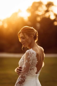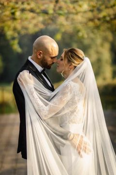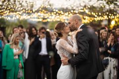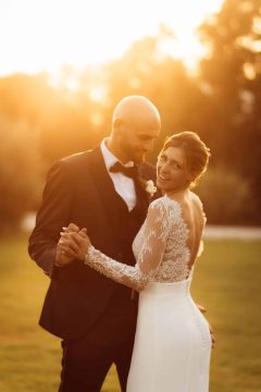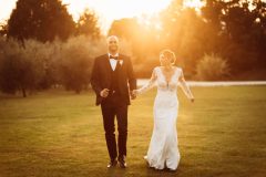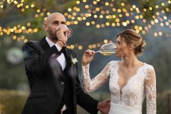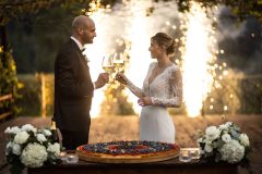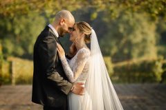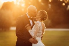 Appena dopo il taglio torta sotto il cielo di lucine della pedana della Tenuta Serradesca, questo secondo giorno di ottobre ci regala una luce caldissima dorata e rossa che accompagna le mie foto di coppia al tramonto.